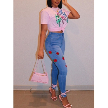 Lovely Stylish Rose Print Blue Plus Size Jeans