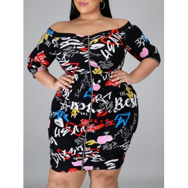 Lovely Trendy Dew Shoulder Letter Print Black Mini Plus Size Dress