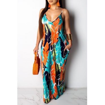 Lovely Stylish Printed Backless Blue Floor Length Dress