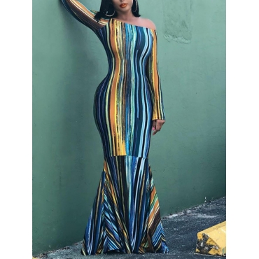 Lovely Party Off The Shoulder Striped Print Blue Floor Length Dress