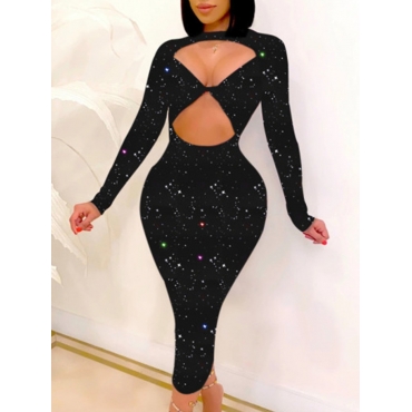 Lovely Sexy Hollow-out Sequined Skinny Black Mid Calf Dress