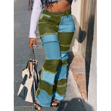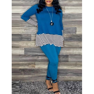 Lovely Casual O Neck Striped Patchwork Blue Two Piece Pants Set