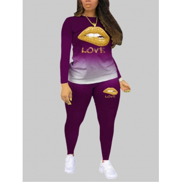 Lovely Casual Lip Print Purple Plus Size Two-piece Pants Set
