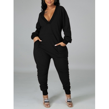 Lovely Casual V Neck Pocket Design Black Plus Size One-piece Jumpsuit