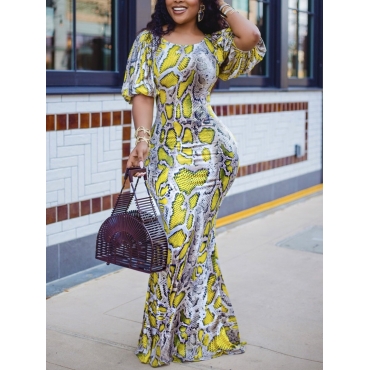 Lovely Sweet Animal Print Puffed Sleeve Yellow Floor Length Dress