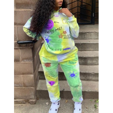 Lovely Street Hooded Collar Long Sleeve Tie Dye Letter Print Yellow Two Piece Pants Set