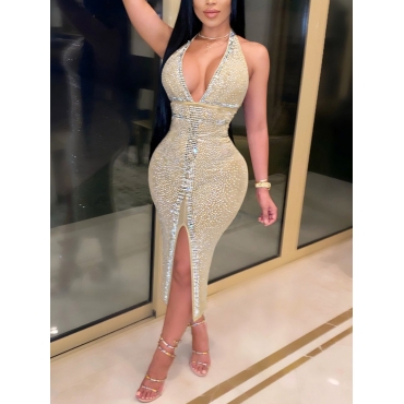Lovely Sexy High Slit Sequined Backless Apricot Ankle Length Evening Dress