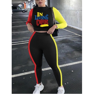 Lovely Casual Letter Print Patchwork Black Two Piece Pants Set