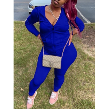 Lovely Casual Hooded Collar Kangaroo Pocket Blue Two Piece Pants Set