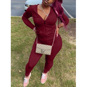 Lovely Casual Hooded Collar Kangaroo Pocket Wine Red Two Piece Pants Set