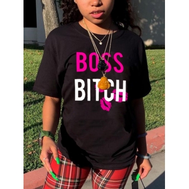 Lovely Sweet O Neck Letter Print Pitch-black T-shirt