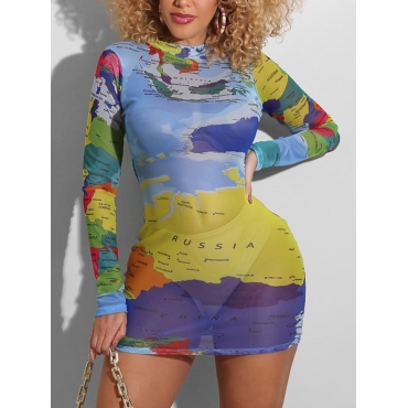 Lovely Street O Neck Print See-through Multicolor Mini Dress