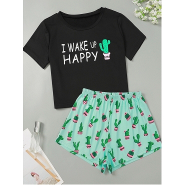Lovely Casual O Neck Letter Print Black Sleepwear
