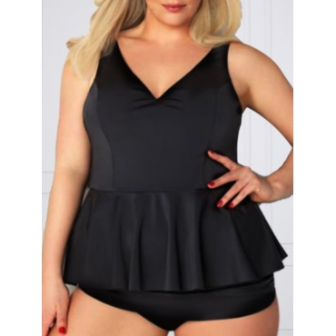 Lovely Casual V Neck Flounce Design Black Plus Size Tankini