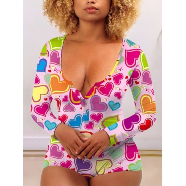 Lovely Casual V Neck Heart-shaped Print Rose Red Sleepwear