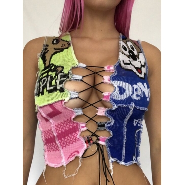 Lovely Sexy Print Patchwork Lace-up Hollow-out Blue Camisole