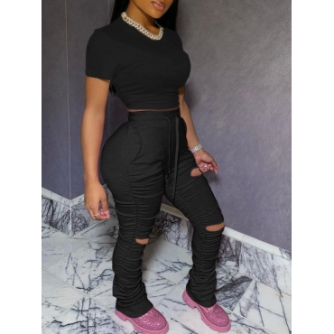 Lovely Casual O Neck Fold Design Black Two Piece Pants Set