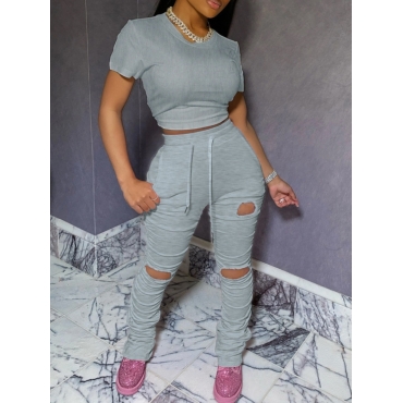 Lovely Casual O Neck Short Sleeve Broken Holes Grey Two Piece Pants Set