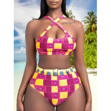 Lovely Trendy Geometric Print Cross Strap Rose Red Two-piece Swimsuit