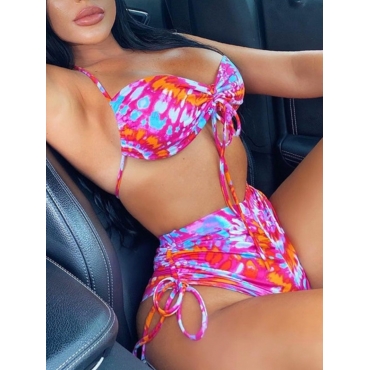 Lovely Sexy Print Lace-up Drawstring Rose Red Two-piece Swimsuit
