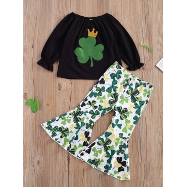 Lovely Casual O Neck Floral Print Flared Black Girl Two Piece Pants Set