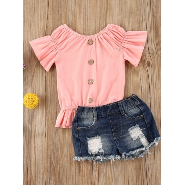 Lovely Casual Button Decoration Broken Hole Flared Pink Girl Two Piece Shorts Set