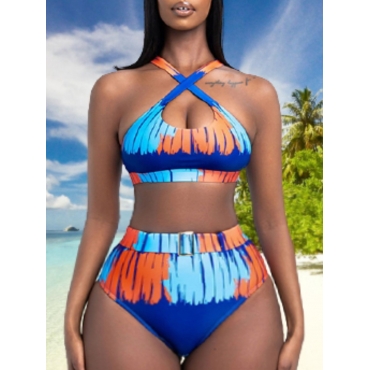 Lovely Trendy Letter Print Cross Strap Blue Two-piece Swimsuit