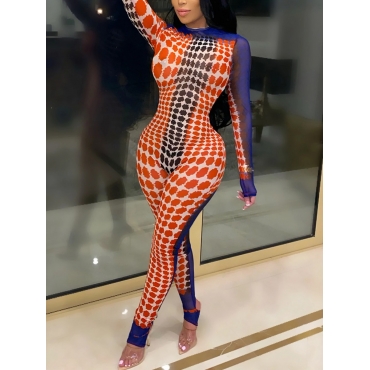 Lovely Chic O Neck Dot Print Patchwork Orange One-piece Jumpsuit