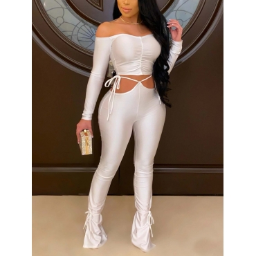 Lovely Sexy Off The Shoulder Bandage Hollow-out Design White Two Piece Pants Set