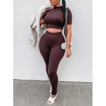 Lovely Sweet Half A Turtleneck Crop Top Brown Two Piece Pants Set