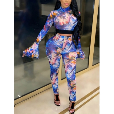Lovely Sweet Flared Print Patchwork Blue Two Piece Pants Set(No-positioning Printing)