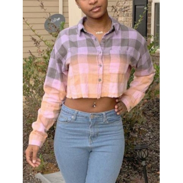 Lovely Casual Gradient Plaid Print Pink Blouse