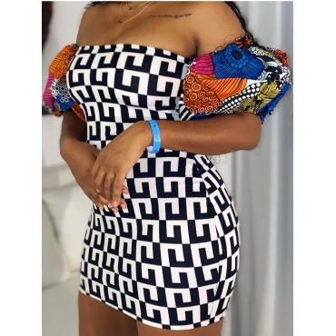Lovely Sweet Off The Shoulder Geometric Print Black Mini Dress