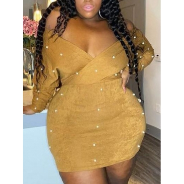 Lovely Party Cross-over Design Pearl Decoration Yellow Mini Plus Size Dress