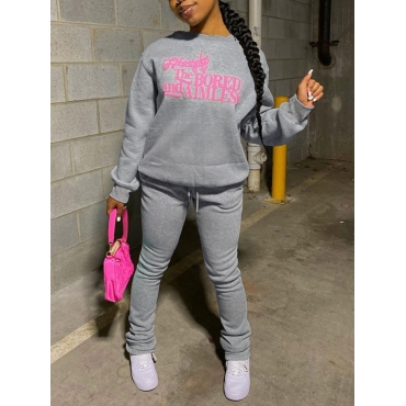 Lovely Casual Dropped Shoulder Letter Print Fold Design Grey Two Piece Pants Set