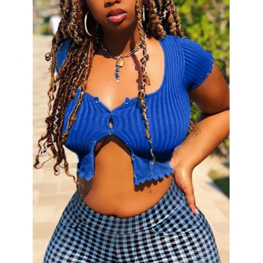 Lovely Sweet Striped Button Design Crop Top Baby Blue T-shirt