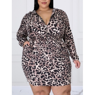 Lovely Casual Hooded Collar Leopard Print Pocket Design Mini Plus Size Dress