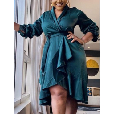 Lovely Stylish Flounce Design Lace-up Dark Green Knee Length Asymmetrical Plus Size Dress