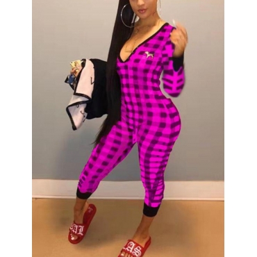 Lovely Casual V Neck Plaid Print Purple One-piece Jumpsuit