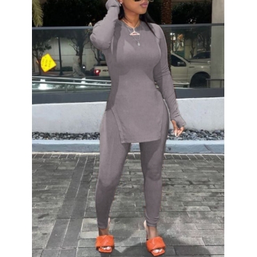 Lovely Casual O Neck Split Grey Two Piece Pants Set