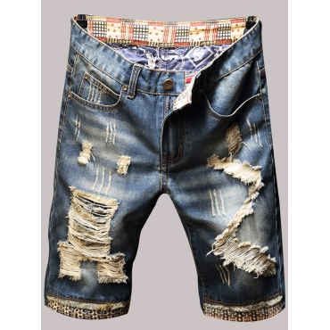 Lovely Casual Mid Waist Ripped Blue Men Denim Shorts