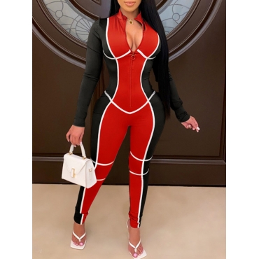Lovely Sweet Striped Color-lump Patchwork Red One-piece Jumpsuit