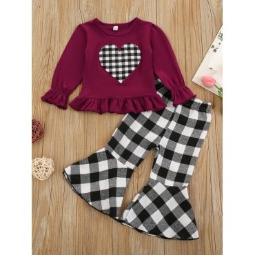 Lovely Casual O Neck Plaid Print Patchwork Flared Wine Red Girl Two Piece Pants Set