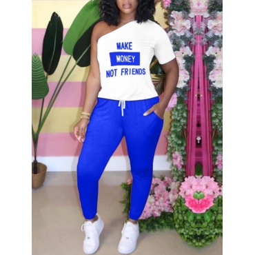 Lovely Casual One Shouder Letter Print Drawstring Design Blue Two Piece Pants Set