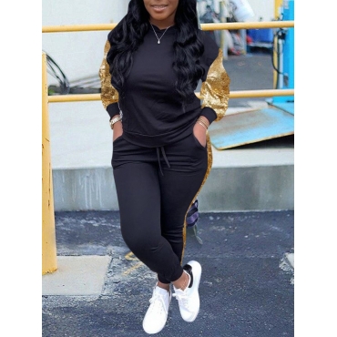 Lovely Sportswear O Neck Drawstring Patchwork Gold Two Piece Pants Set