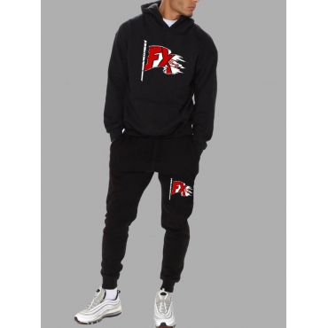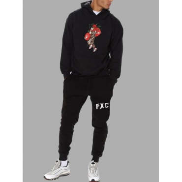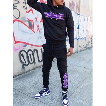Lovely Casual Hooded Collar Letter Print Black Men Two Piece Pants Set
