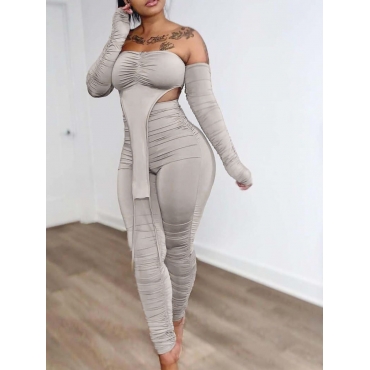 Lovely Sweet Off The Sghoulder Ruched Asymmetrical Beige Two Piece Pants Set