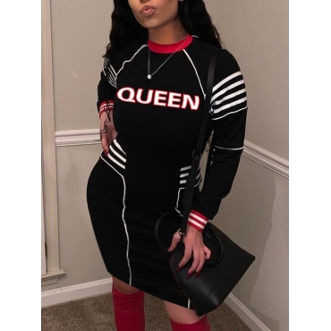 Lovely Trendy Letter Print Striped Black Knee Length Dress