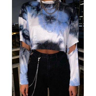 Lovely Casual O Neck Tie-dye Hollow-out Blue T-shirt(No-positioning Printing)
