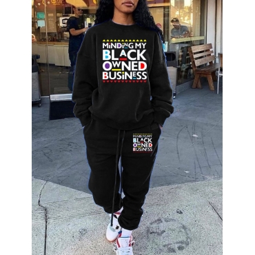 Lovely Street O Neck Letter Print Drawstring Design Black Two Piece Pants Set